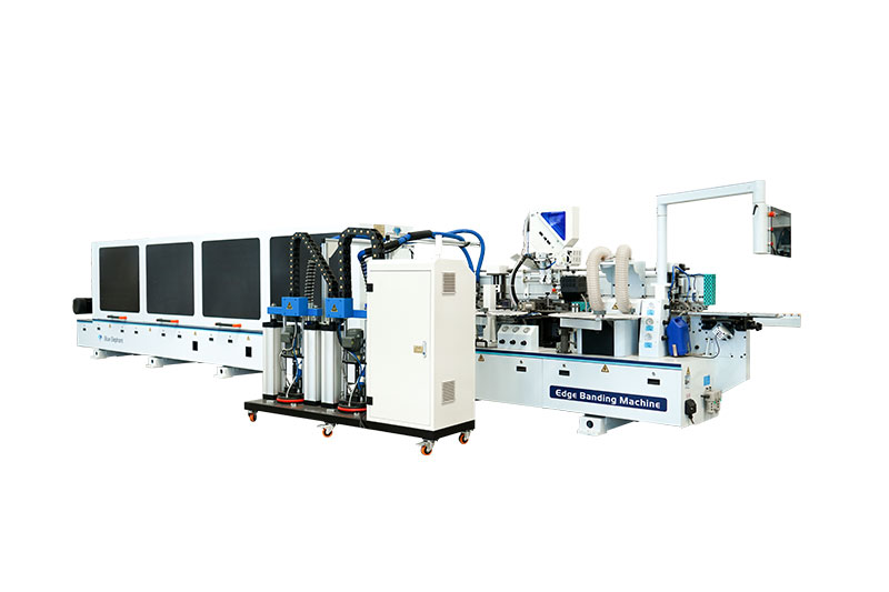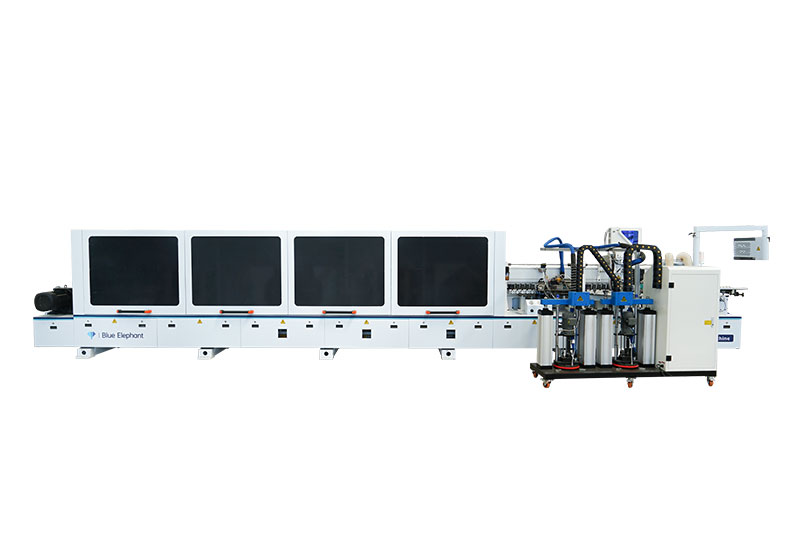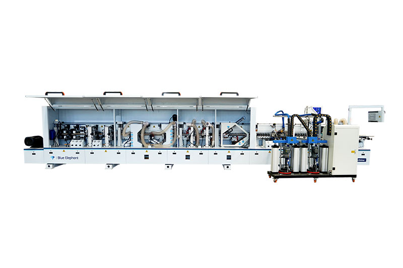 E-80全自動封邊機(jī)功能:前分離-預(yù)銑-上膠鍋+快速溶膠六輪壓貼1-下膠鍋+六輪壓貼2-快速齊頭-氣動精修1-氣動精修2-四頭跟蹤倒角-氣動刮邊1-氣動刮邊2-斷絲+平刮-后清洗-拋光1-拋光2