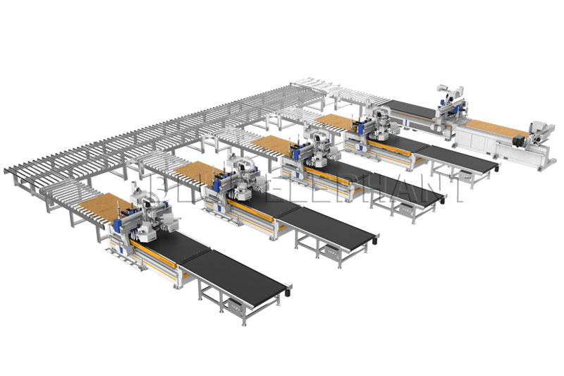 一托四模壓門板生產(chǎn)線組成:貼標(biāo)機、自動上下料齒條開料機 、動力輥筒線、翻板機、自動上下料絲杠機